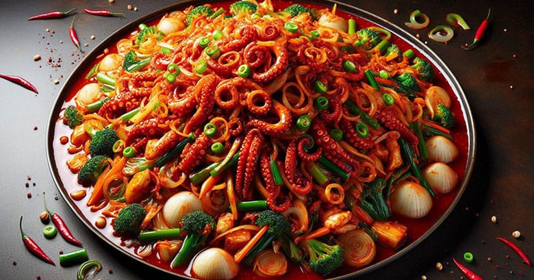 - イイダコ(チュクミ)を辛いソースで炒め、野菜と一緒に仕上げる料理である。